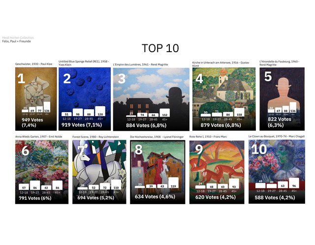 Besonders spannend ist der Blick auf die beliebtesten Werke. Paul Klees Geschwister und Yves Kleins erstes blaues Schwammrelief führten die Rangliste an, gefolgt von Gustav Klimts Kirche in Unterach am Attersee. Interessant ist auch, dass Werke mit surrealen Elementen wie René Magrittes L'Empire des Lumières generationenübergreifend Anklang fanden.