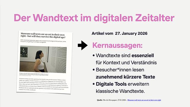 Der Wandtext: Kaum ein Vermittlungsformat ist so etabliert – und zugleich so umstritten. Zwischen Platzmangel, Informationsdichte und begrenzter Aufmerksamkeit der Besucher:innen entsteht häufig das, was im Vortrag augenzwinkernd als „Wandtext-Wüste“ bezeichnet wurde.