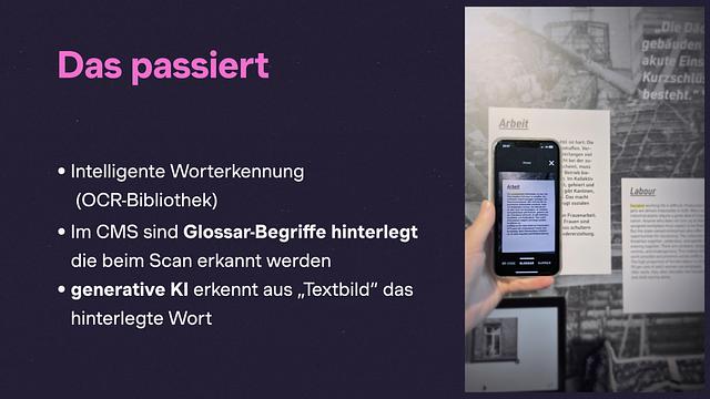 Im Hintergrund arbeitet eine Texterkennung, die die Inhalte der Wandtexte analysiert und mit einem redaktionell gepflegten System verknüpft. Im Grunde entsteht so ein dynamisches Glossar, das direkt mit der Ausstellung verbunden ist.