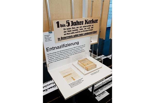 Die drei durch die Ausstellung laufenden Zeitlinien NS-Zeit – Nachkriegszeit – Gegenwart sollen verdeutlichen, dass Letztere nicht losgelöst von ihren historischen Wurzeln betrachtet werden kann. Bei eingehender Auseinandersetzung zeigt sich, wie nachhaltig die NS-Zeit die politischen Entscheidungen der Nachkriegszeit geprägt hat. Die Folgen waren in Österreich bis in die frühen 2000er-Jahre offen sichtbar; unser ambivalentes Verhältnis zur eigenen Rolle in der NS-Diktatur ist noch heute spürbar.[7]