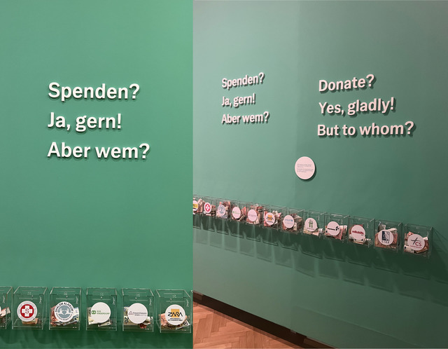 Dreizehn Spendenboxen am Ende des Ausstellungsrundgangs luden Besucher:innen dazu ein, gezielt Organisationen wie ESRA, den Samariterbund oder den Verein der Wiener Frauenhäuser zu unterstützen. Die Auswahl spiegelte Vielfalt und gesellschaftliche Relevanz wider und wurde durch eine interne Abstimmung getroffen.